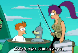 Leela's right. Fishing blows. What do you say we make it interesting? Everybody kick in five bucks. There, wasn't that interesting? Bender!
