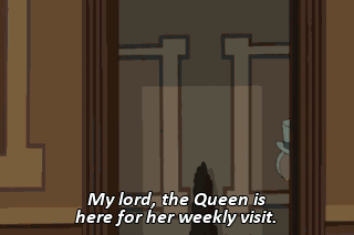 My lord, the Queen is here for her weekly visit. The Queen? Sounds most satisfactory. All of you, out! Right then. Let's go play some quoits, whatever that is.