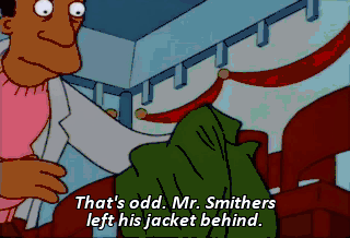 That's odd. Mr. Smithers left his jacket behind. Whoa, that's odd. Principal Skinner left his mother behind.
