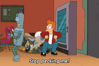 Stop pecking me! Hey! (YELLS) Leggo my eggo, crabbo! Stop it, Fry. That's sexual harassment! Yeah, come down off your round, white pulpit. You're just going to eat that thing anyway.