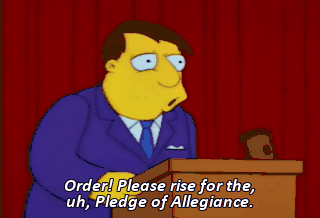 Order! Please rise for the, uh, Pledge of Allegiance.