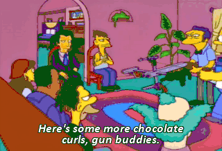 Here's some more chocolate curls, gun buddies. Anyone else want a beer? Homer, you use your gun as a can opener? I use it for everything. Watch me turn on the TV.