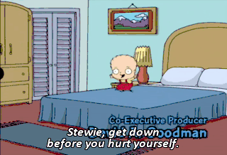 Stewie, get down before you hurt yourself. Shut up! You're not my mother! Good God! Are you all right? Fine. Why do you ask?