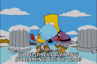 (SOBS) (TIRES SQUEALING) (SCREAMING) Car! Car what? Car is the subject, but I don't know the verb. SELMA: Wha... (SIZZLING) (PANTING)