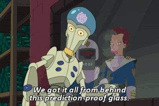 We got it all from behind this prediction-proof glass. But how could you know my prediction was fake? I knew something was wrong, but I couldn't put my finger on it. Then, it hit me.