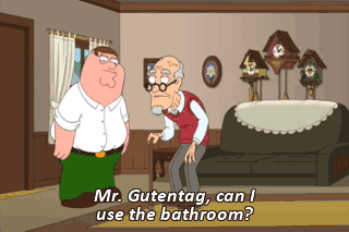 Mr. Gutentag, can I use the bathroom? Of course. Down the hall to the right. It's the door marked... (SPEAKING GERMAN)