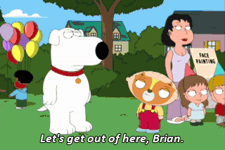 Let's get out of here, Brian. That birthday party Spider-Man is eyeing me. Don't let me catch you, 'cause I'll just wrap you up and eat you later. (LAUGHING) Hang on a second. Who's that?