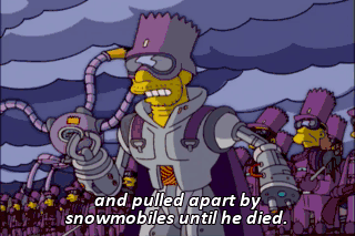 and pulled apart by snowmobiles until he died. ALL: Eat my shorts!