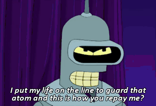 I put my life on the line to guard that atom and this is how you repay me? Well, you can go rot for all I care. Nah, I'm just kidding. You guys are all right.