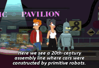 Here we see a 20th-century assembly line where cars were constructed by primitive robots.