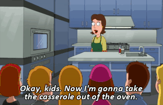 Okay, kids. Now I'm gonna take the casserole out of the oven.