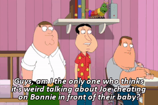 Guys, am I the only one who thinks it's weird talking about Joe cheating on Bonnie in front of their baby? MALE VOICE: I think we can all benefit from a little strange now and then. I know I will.