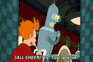 (ALL CHEER) Fry! You're alive! Not only that, I now know exactly how to end my comic book. Let's watch.