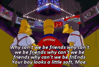 Why can't we be friends why can't we be friends why can't we be friends why can't we be friEnds Your boy looks a little soft, Moe.