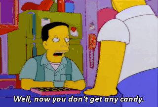 Well, now you don't get any candy. No, that's cruel. Take a teensy piece. No. Homer, what have you got against gays?