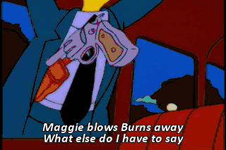 Maggie blows Burns away What else do I have to say They'll never stop The Simpsons Have no fears We've got stories for years Like Marge becomes a robot Maybe Moe gets a cell phone Has Bart ever owned a bear