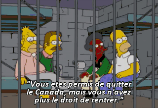"Vous etes permis de quitter le Canada, mais vous n'avez plus le droit de rentrer." I am a big, fat, French idiot. "Je suis un grand gros..." Hey!