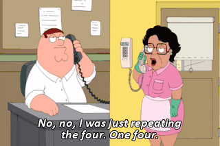 No, no, I was just repeating the four. One four. One, four... All right, let's start over. Four, zero, one. Four. Zero. Zero... - One. - One. Four, zero, one. Yes. Five, five, five.