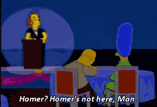 Homer? Homer's not here, Man. Okay, very good. Now let's get on with our... really big show. Ed Sullivan. Shh! First, the award for the alumnus who's gained the most weight-- Homer Simpson! Oh, my God!