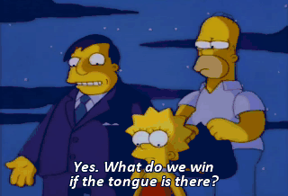 Yes. What do we win if the tongue is there? - Credibility. - Aw. What a gyp.