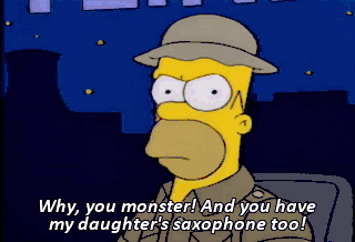 Why, you monster! And you have my daughter's saxophone too! Homer! That's our stage manager! Oh. Sorry. I'm a little nervous. It may interest you to know that for my next crime,