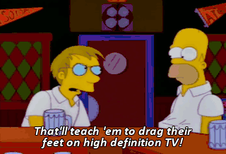 That'll teach 'em to drag their feet on high definition TV! - You're under arrest for conspiracy! - Oh! Oh!