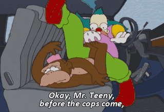 Okay, Mr. Teeny, before the cops come, swallow all these illegal pills, then run to the vet. (TEENY CHATTERING)