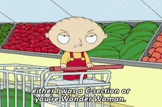 either I was a C-section or you're Wonder Woman. Chris, would you run and get some milk? And be sure to take it from the back. Take on me take me on take on me
