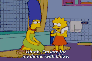 Uh-oh. I'm late for my dinner with Chloe. (GIGGLES)