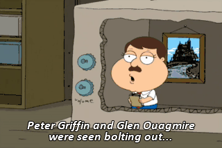 Peter Griffin and Glen Ouagmire were seen bolting out... ...of the supposedly haunted house after just one half-hour... ...Ieaving only their pride and twin trails of urine behind them.
