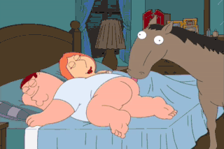 Peter, take Maple Drive. Otherwise we won't make the movie on time. All right. Uh-oh! What is it? The horse is right behind the car. Peter, that thing is just creepy.