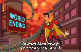Coward Man away! (WOMAN SCREAMS) (BABBLING) Some of us were crazy before it was cool. Evacuating the planet in three, two... So long, Earth. Thanks for nothing.