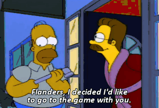 Flanders, I decided I'd like to go to the game with you. Well, get out the Crayolas and color me tickled pink. Ooh, what's with the lead pipe? Were you gonna give my noggin a floggin'? Well, yeah.