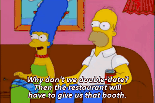 Why don't we double-date? Then the restaurant will have to give us that booth. Wow, a booth! If I'm tired, I can just lie down.