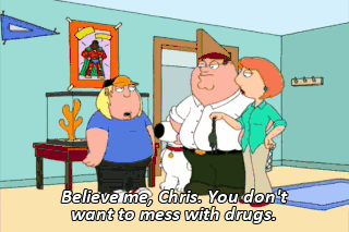 Believe me, Chris. You don't want to mess with drugs. I tried 'em once. Big mistake. Things got way too real. Holy crap! I am freaking out! Peter, may I?