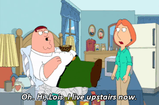 Oh. Hi, Lois. I live upstairs now. What? That's right. I made a nest of my old underwears on which to lay my eggs, and I shall raise my young in this room alone. Peter, you're being an idiot.