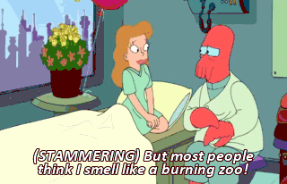 (STAMMERING) But most people think I smell like a burning zoo! I never learned a good smell from a bad smell, but I like the way you smell, because I like you. BOTH: Mmm...