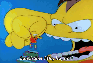 Lunchtime ! Ha, ha, ha ! Lunchtime ! Aah ! Lunchtime, Bart. It's lunchtime. I ain't gonna get out of the fourth grade alive. You've gotta tell Principal Skinner, Bart. I can't squeal.