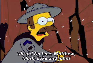 Uh-oh! No time. Matthew, Mark, Luke and john! Hey, where are the sissy and the bald guy goin', huh?