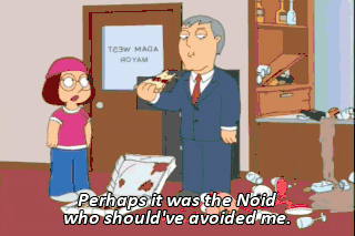 Perhaps it was the Noid who should've avoided me. You know what, Brian? It took me two hours to spell "hat" with these things. I finally got the "T" right side up, and then you come in here...