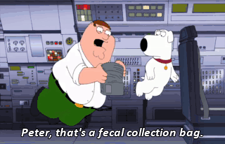 Peter, that's a fecal collection bag. Oh, there's a bag for that? 'Cause mine's over there twirling in the air like a slow baton. STEWIE: Well, someone's got to lead this marching band. Ew!