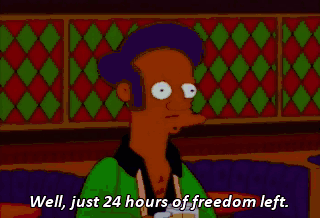 Well, just 24 hours of freedom left. Actually, it's more like 12. No. I'm so stupid. Seven. It's seven hours. You have seven hours. See? Seven.