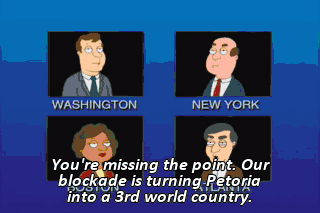 You're missing the point. Our blockade is turning Petoria into a 3rd world country. Ok, Can anybody tell me what the square root of the hypotenuse is when... Chris, is that a note? No. Yes, it is.
