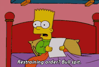 Restraining order? Bull spit. No piece of paper keeps me from waling on my sister. (KISSING) So you see what happens when you don't obey your restraining order?