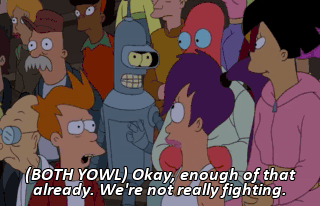 (BOTH YOWL) Okay, enough of that already. We're not really fighting.