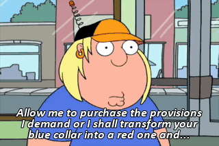 Allow me to purchase the provisions I demand or I shall transform your blue collar into a red one and... Who the deuce are you?