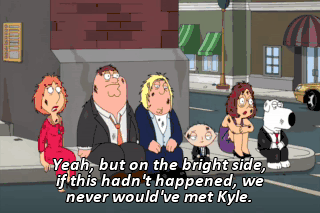 Yeah, but on the bright side, if this hadn't happened, we never would've met Kyle. - Hey. - BRIAN: Hello. PETER: Hey there. CHRIS: What's up?