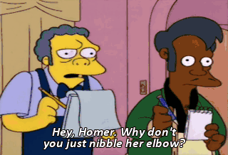 Hey, Homer. Why don't you just nibble her elbow? That always melts her butter, right? Heh, heh, heh. All right. Okay. Everybody out! Ooh, she's gotta have it.