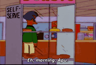 Eh, morning, Apu. Good morning. One doughnut with sprinkles, and-- Wait a minute. These are not sprinkles, sir.