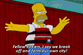 Fellow 939'ers, I say we break off and form our own city! Yes! We're with you, Homer! Come on! Let's go! Viva la revolución! Now who's stupid?